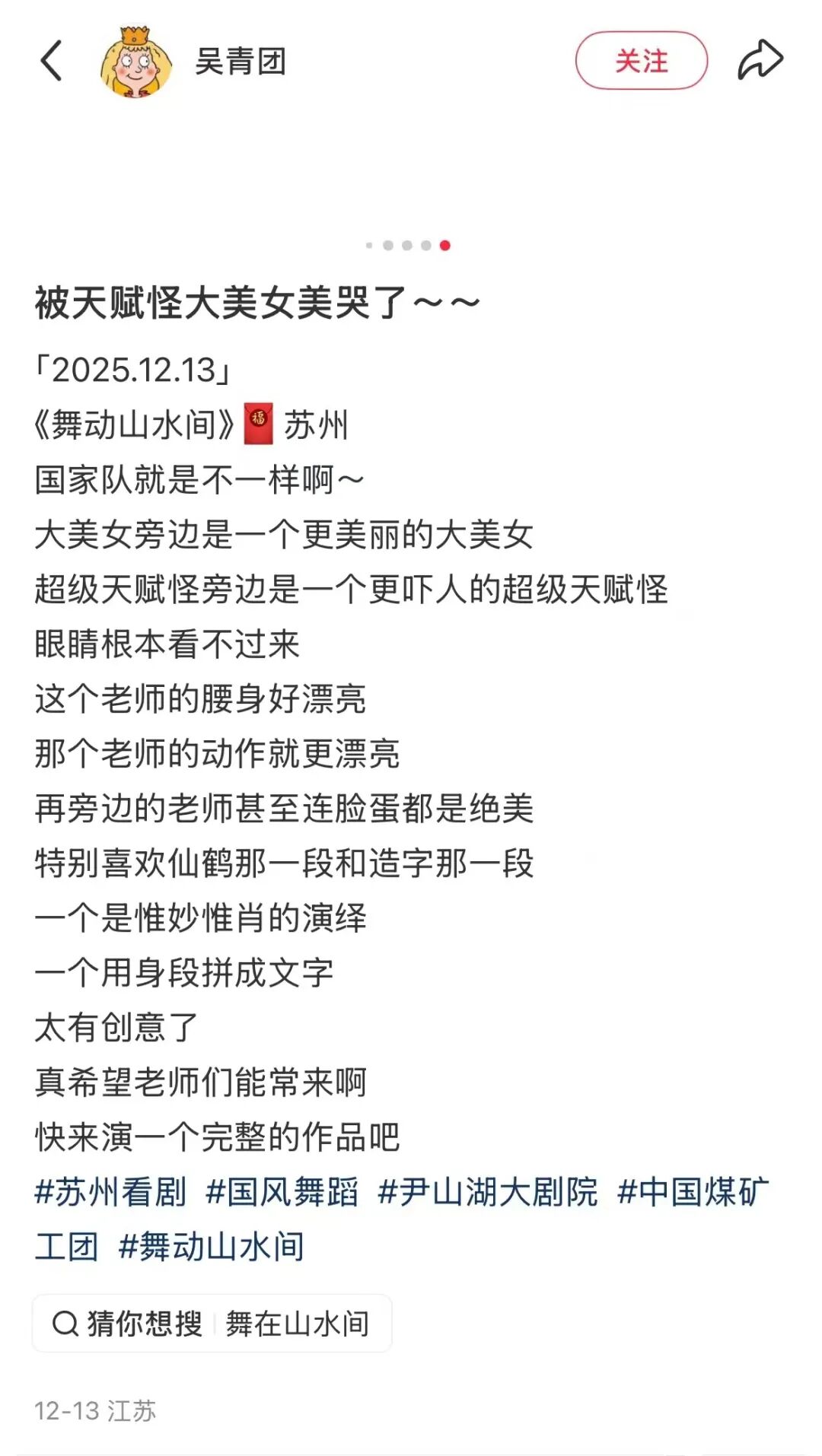 2025年12月9-19日,中国煤矿文工团《舞动山水间》舞蹈专场圆满完成赴内蒙古自治区兴安盟、福建南平、江苏苏州、浙江嘉兴、陕西安康、四川简阳6城7场的全国巡演。