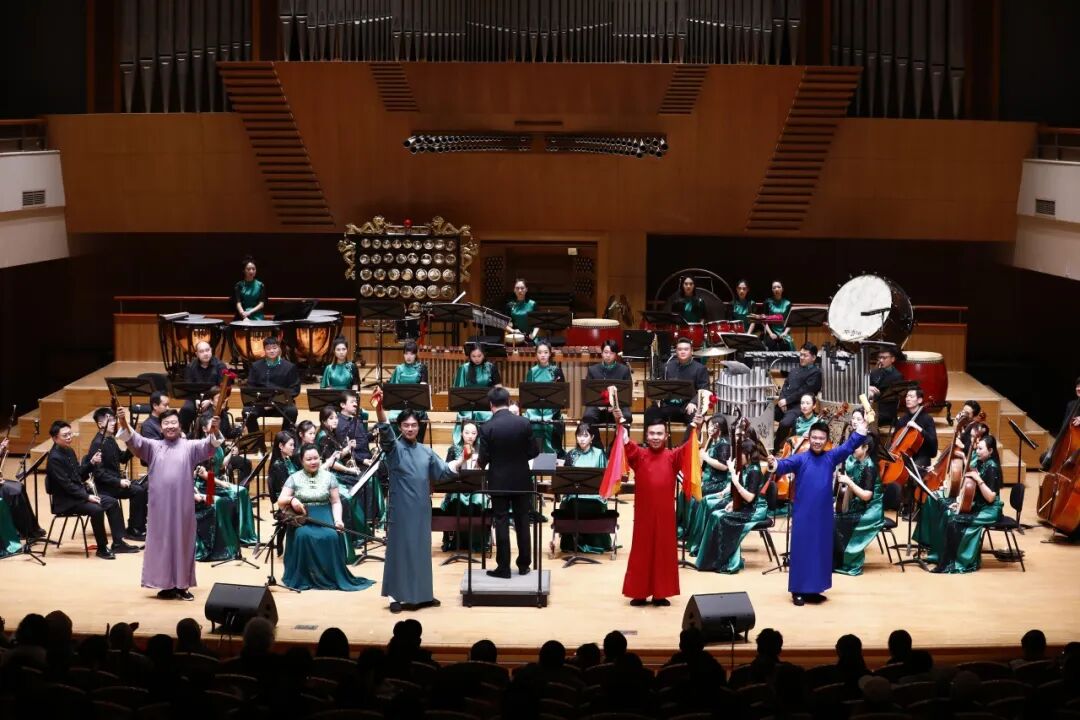 作为“古城新韵”系列音乐会的延续之作,《乐萃京城》以北京城古今变迁为叙事脉络,创新融合了传统民乐、曲艺以及声乐等多元艺术形式,用极具沉浸式的听觉效果向观众娓娓道来老北京城的悠悠岁月。序曲《燕京破晓》拉开晨曦中的古城序幕;笙独奏《流年陌巷》勾勒的胡同烟火;京胡与三弦对话的《中轴里的味道》展现古今变迁,每一首作品都各具韵味。特别是融合三弦、滑稽大鼓与快板的《宛平城》,以新颖的曲艺叙事与管弦乐结合,尽显地道的老北京风情;笛子名家唐俊乔演绎的《什刹海》,用清澈笛声描摹水系灵动;压轴之作《北京新貌》大胆融入说唱与女声演唱来表达新时代北京的蓬勃活力,每一曲终了都引发全场热烈掌声。